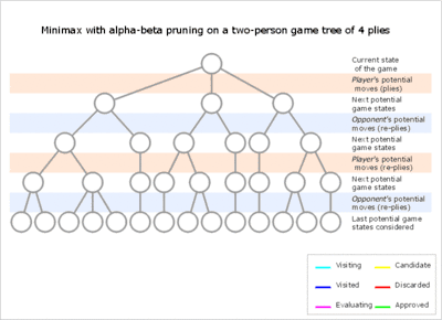 Alpha–beta pruning is a search algorithm that seeks to decrease the number of nodes that are evaluated by the minimax algorithm in its search tree. It is an adversarial search algorithm used commonly for machine playing of two-player combinatorial games (Tic-tac-toe, Chess, Connect 4, etc.). It stops evaluating a move when at least one possibility has been found that proves the move to be worse than a previously examined move. Such moves need not be evaluated further. When applied to a standard minimax tree, it returns the same move as minimax would, but prunes away branches that cannot possibly influence the final decision.[1]