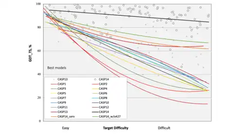 AlphaFold software has had three major versions. A team of researchers that used AlphaFold 1 (2018) placed first in the overall rankings of the 13th Critical Assessment of Structure Prediction (CASP) in December 2018. The program was particularly successful at predicting the most accurate structure for targets rated as the most difficult by the competition organisers, where no existing template structures were available from proteins with a partially similar sequence. A team that used AlphaFold 2 (2020) repeated the placement in the CASP14 competition in November 2020.[3] The team achieved a level of accuracy much higher than any other group.[2][4] It scored above 90 for around two-thirds of the proteins in CASP's global distance test (GDT), a test that measures the degree to which a computational program predicted structure is similar to the lab experiment determined structure, with 100 being a complete match, within the distance cutoff used for calculating GDT.[2][5]