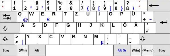 The Finnish multilingual keyboard standard adds many new characters to the traditional layout via the AltGr key, as shown in the image below (the blue characters can be written with the AltGr key; several dead key diacritics, shown in red, are also available as an AltGr combination).[8][9]