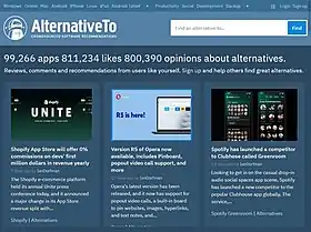 AlternativeTo is a website which lists alternatives to web-based software, desktop computer software, and mobile apps, and sorts the alternatives by various criteria, including the number of registered users who have clicked the "Like" button for each of them on AlternativeTo.[3]