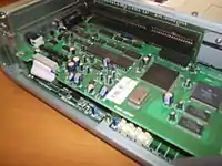 The motherboard includes a 16 bit ISA slot connected to a riser card, providing a total of two 16 bit ISA slots. One of these slots is populated with an ISA card, which provides connections for sound at the rear of the machine and a connection for the Mega Drive cartridge at the front. The other slot was left free for expansion (such as the addition of a modem or Network Interface Card).[4]