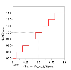 where M is the ADC's resolution in bits and EFSR is the full-scale voltage range (also called 'span'). EFSR is given by