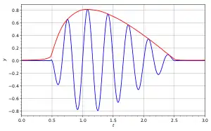 Sometimes the phrase "complex envelope" is given the simpler meaning of the complex amplitude of a (constant-frequency) phasor;[lower-alpha 1][lower-alpha 2] other times the complex envelope as defined above is interpreted as a time-dependent generalization of the complex amplitude.[lower-alpha 3] Their relationship is not unlike that in the real-valued case: varying envelope generalizing constant amplitude.