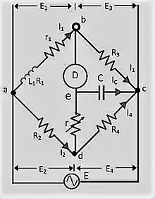 The balance conditions for Anderson's bridge or, equivalently the values of the self-inductance and resistance of the given coil can be found using basic circuit analysis techniques such as KCL, KVL and using phasors. Consider the circuit diagram of Anderson's bridge in the given figure. Let L1 be the self-inductance and R1 be the electrical resistance of the coil under consideration. Since the voltmeter is ideally assumed to have nearly infinite impedance, the currents in branches ab and bc and those in the branches de and ec are taken to be equal. Applying Kirchhoff's current law at node d, it can be shown that-