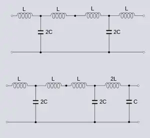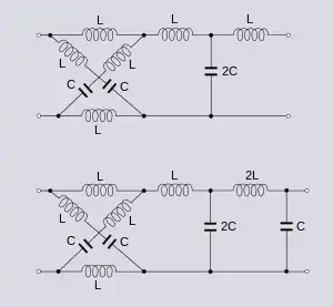 Symmetric and antimetric networks are often also topologically symmetric and antimetric, respectively. The physical arrangement of their components and values are symmetric or antimetric as in the ladder example above. However, it is not a necessary condition for electrical antimetry. For example, if the example networks of figure 1 have an additional identical T-section added to the left-hand side as shown in figure 2, then the networks remain topologically symmetric and antimetric. However, the network resulting from the application of Bartlett's bisection theorem[2] applied to the first T-section in each network, as shown in figure 3, are neither physically symmetric nor antimetric but retain their electrical symmetric (in the first case) and antimetric (in the second case) properties.[3]