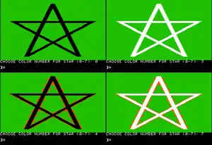 The Lo-Res graphics mode offered built-in commands to clear the screen, change the drawing color, plot individual pixels, plot horizontal lines, and plot vertical lines. There was also a "SCRN" function to extract the color stored in any pixel, one lacking in the other modes.