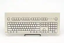 The first keyboard not to be integrated into the case like the Apple II and III series before it. It was designed for and came with the Apple Lisa. Like the Apple III before it, it was intended to be a business computer and included an integrated numeric keypad. Like all Apple computers before it, it came in a beige case to match the Lisa and connected by a unique TRS connector. In addition it carried over the use of the "open" Apple key from the Apple III as a command key (though it was represented by the "closed" Apple character) and included a pullout reference guide hidden under the keyboard.