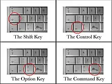 - The Option key (⌥), for entering diacritics and other special characters. Like the Shift and Control keys, the Option key serves as a modifier for the Command key shortcuts, as well as being used to type many special characters. It serves the function of the solid-Apple key in Apple II applications. It functions as the Alt key in Unix and Windows environments. Compared to their equivalents on the standard IBM PC keyboard layout the Command key and the Option key are located in reverse order.