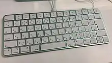 The Magic Keyboard is Apple's current design of external keyboards designed for use with Mac computers. It can use either wireless Bluetooth connectivity, or a wired connection via a USB to Lightning cable. It utilizes scissor-switch key mechanisms, and comes in several layouts and colors, including the option of a Numeric Keypad, Touch ID fingerprint authentication, and colors to match each color variant of the M1 iMac.
