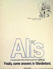 Applix's first office suite, introduced in 1986, was called Alis, and was marketed with Alice's Adventures in Wonderland themed promotional items. One such was a mug depicting the tea party scene from the book, with a Cheshire Cat that disappeared when the mug was filled with a hot beverage.