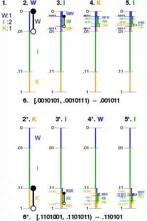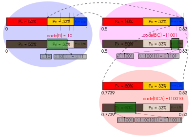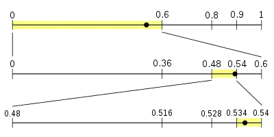 | 3–5. | The corresponding interval is iteratively partitioned for each letter in the message. |