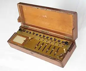 The arithmometer is a brass instrument housed in a wooden box often made of oak or mahogany and for the oldest ones ebony (solid or veneer). The instrument itself is divided into two parts.
