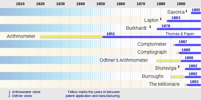 Its production debut of 1851[2] launched the mechanical calculator industry[3] which ultimately built millions of machines well into the 1970s. For forty years, from 1851 to 1890,[6] the arithmometer was the only type of mechanical calculator in commercial production, and it was sold all over the world. During the later part of that period two companies started manufacturing clones of the arithmometer: Burkhardt, from Germany, which started in 1878, and Layton of the UK, which started in 1883. Eventually about twenty European companies built clones of the arithmometer until the beginning of World War I.