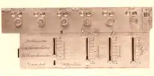 The arithmometers of this period were four-operation machines; a multiplicand inscribed on the input sliders could be multiplied by a single-digit multiplier by simply pulling on a ribbon (quickly replaced by a crank handle). It was a complicated design[7] and very few machines were built. Additionally, no machines were built between 1822 and 1844.