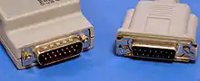 The Attachment Unit Interface (AUI) is a physical and logical interface defined in the original IEEE 802.3 standard for 10BASE5 Ethernet[1] and the previous DIX standard. The physical interface consists of a 15-pin D-subminiature connection that provides a path between an Ethernet node's physical signaling and the Medium Attachment Unit (MAU),[2] sometimes also known as a transceiver. An AUI cable may be up to 50 metres (160 feet) long, although frequently the cable is omitted altogether and the MAU and medium access controller MAC are directly attached to one another. On Ethernet implementations without separate MAU and MAC, the AUI is omitted.
