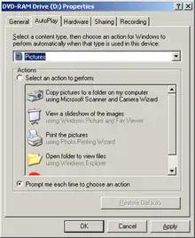 AutoPlay, a feature introduced in Windows 98, examines newly discovered removable media and devices and, based on content such as pictures, music or video files, launches an appropriate application to play or display the content.[1] It is closely related to the AutoRun operating system feature. AutoPlay was created in order to simplify the use of peripheral devices – MP3 players, memory cards, USB storage devices and others – by automatically starting the software needed to access and view the content on these devices. AutoPlay can be enhanced by AutoPlay-compatible software and hardware. It can be configured by the user to associate favourite applications with AutoPlay events and actions.