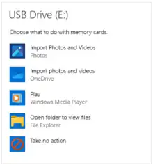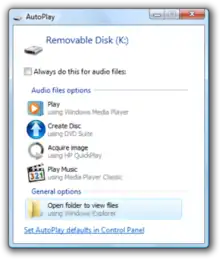 AutoPlay is a feature introduced in Windows XP which examines removable media and devices and, based on content such as pictures, music or video files, launches an appropriate application to play or display the content.[1] If available, settings in an autorun.inf file can add to the options presented to the user.