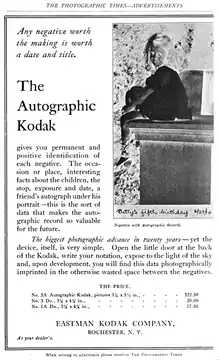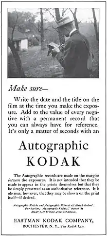 Kodak's autographic films had "A" as the first part of the film size designation. Thus, standard 122 film would be labeled "122" and autographic 122 would be "A122". Autographic roll film sizes were A116, A118, A120, A122, A123, A126, A127, and A130.[1] The autographic feature was marketed as having no extra charge.[2] In 1915, Kodak also sold upgrade autographic backs for their existing cameras.[3]