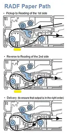 There are two kinds of document feeders capable of two-sided (duplex) scanning: a reversing automatic document feeder or RADF scans one side of a page, then flips it and scans the other side. A duplexing automatic document feeder or DADF scans both sides in one pass. The advantage of the DADF is faster speed for two-sided originals. RADFs and DADFs are rated in images per minute (IPM), the number of sides they can scan each minute; this may depend upon the resolution being used (rather than the maximum resolution supported).