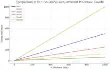 BLAST generally runs at a speed of O(n), where n is the size of the database.[21] The time to complete the search increases linearly as the size of the database increases. MPIblast utilizes parallel processing to speed up the search. The ideal speed for any parallel computation is a complexity of O(n/p), with n being the size of the database and p being the number of processors. This would indicate that the job is evenly distributed among the p number of processors. This is visualized in the included graph. The superlinear speedup that can sometimes occur with MPIblast can have a complexity better than O(n/p). This occurs because the cache memory can be used to decrease the run time.[22]