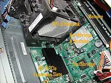 - Thermal design – The BTX layout establishes a straighter path of airflow with fewer obstacles, resulting in better overall cooling capabilities. There is no dedicated CPU fan – instead, a large 12 cm case fan is mounted, drawing its air directly from outside the computer and cooling the CPU through an airduct. Another distinct feature of BTX is the vertical mounting of the motherboard on the left-hand side. This results in the graphics card heatsink or fan facing upwards, rather than in the direction of the adjacent expansion card.