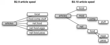 News B2.10 introduced the hierarchical article storage format carried into C News and InterNetNews, and still commonly seen in many newsreaders and cache programs. Before B2.10, all groups were stored beneath a single parent directory, impairing performance when the group list became large, and requiring that the first 14 characters be unique among all groups due to an old Unix limitation. The hierarchical layout split the groups at the periods, reducing directory sizes and ameliorating the uniqueness problem.