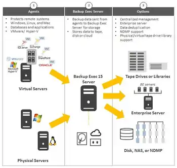 Backup Exec installations can have one or more Backup Exec servers, which are responsible for moving data from one or more locations to a storage medium, including cloud, disk, tape, and OST device. The data may be from the local system or from a remote system.[19] There are two primary Backup Exec architectures: