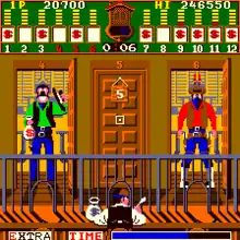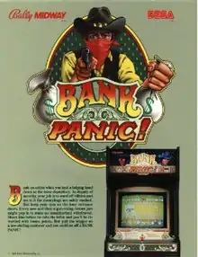 Bank Panic[5] is an arcade shooter game developed by Sanritsu Denki and released by Sega in 1984.[3] Bally-Midway manufactured the game in the US. The player assumes the part of an Old West sheriff who must protect a bank and its customers from masked robbers.