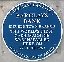 A plaque in Enfield, United Kingdom commemorating the installation of the world's first cash machine by Barclays in 1967