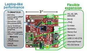 The BeagleBoard is a low-power open-source single-board computer produced by Texas Instruments in association with Digi-Key and Newark element14. The BeagleBoard was also designed with open source software development in mind, and as a way of demonstrating the Texas Instrument's OMAP3530 system-on-a-chip.[8] The board was developed by a small team of engineers as an educational board that could be used in colleges around the world to teach open source hardware and software capabilities. It is also sold to the public under the Creative Commons share-alike license. The board was designed using Cadence OrCAD for schematics and Cadence Allegro for PCB manufacturing; no simulation software was used.