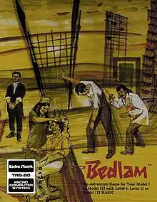Bedlam is a TRS-80 based text adventure game written for the TRS-80 by Robert Arnstein and released by Tandy Corporation in 1982.[1] It was ported to the TRS-80 Color Computer.[2] The object of the game is to escape a lunatic asylum. There are several ways to escape but only one random exit is active each time the game is loaded.