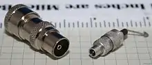 The Belling-Lee connector (also type 9,52, but largely only in the context of its specification, IEC 61169, Part 2: Radio-frequency coaxial connector of type 9,52)[1] is commonly used in Europe, parts of Southeast Asia, and Australia, to connect coaxial cables with each other and with terrestrial VHF/UHF roof antennas, antenna signal amplifiers, CATV distribution equipment, TV sets, and FM and DAB radio receivers. In these countries, it is known colloquially as an aerial connector, IEC connector, or simply as a TV aerial connector. It is one of the oldest coaxial connectors still commonly used in consumer devices. For television signals, the convention is that the source has a male connector and the receptor has a female connector. For FM radio signals, the convention is that the source has a female connector and the receptor has a male connector. This is more or less universally adopted with TV signals, while it is not uncommon for FM radio receivers to deviate from this, especially FM radio receivers from companies not based in the areas that use this kind of connector.