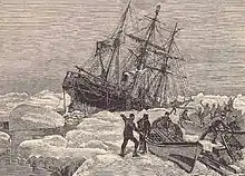 By his fourth expedition, Leigh Smith's enthusiasm for Arctic exploration had advanced to the point that he had his own vessel—Eira—specially built.[3] Eira was built at the Scottish shipyard of Stephen & Forbes at Peterhead as a three-masted, steam-equipped screw barquentine from 1879 to 1880. John and David Gray pioneered steam engine ships and the Eira was designed along the lines of the whaler Hope and Windward. At 125 feet (38 m) long and 360 tons the Eira was seven feet longer and forty tons heavier that the Windward—built in 1866 with a 30 hp steam engine—but an otherwise close copy. The ship's hull was three feet thick and the bow had a thickness of eight feet. After launching the Eira was towed to Aberdeen where a 50 hp steam engine was installed.
