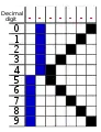 Bi-quinary coded decimal is a numeral encoding scheme used in many abacuses and in some early computers, including the Colossus.[2] The term bi-quinary indicates that the code comprises both a two-state (bi) and a five-state (quinary) component. The encoding resembles that used by many abacuses, with four beads indicating the five values either from 0 through 4 or from 5 through 9 and another bead indicating which of those ranges (which can alternatively be thought of as +5).