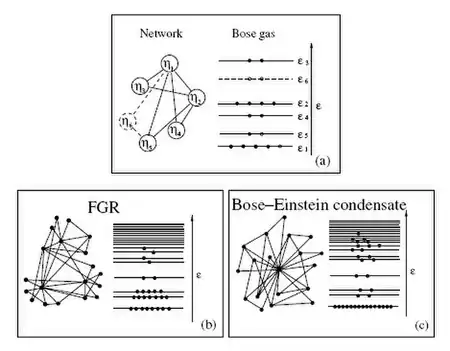 The mapping of a Bose gas predicts the existence of two distinct phases as a function of the energy distribution. In the fit-get-rich phase, describing the case of uniform fitness, the fitter nodes acquire edges at a higher rate than older but less fit nodes. In the end the fittest node will have the most edges, but the richest node is not the absolute winner, since its share of the edges (i.e. the ratio of its edges to the total number of edges in the system) reduces to zero in the limit of large system sizes (Fig.2(b)). The unexpected outcome of this mapping is the possibility of Bose–Einstein condensation for T < TBE, when the fittest node acquires a finite fraction of the edges and maintains this share of edges over time (Fig.2(c)).