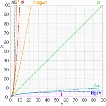 | linearithmic, loglinear, quasilinear, or "n log n" | Performing a fast Fourier transform; fastest possible comparison sort; heapsort and merge sort | |