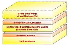 - At first, it is a hybrid dataflow emulator running multithreadedly on commodity SMP. The SMP ensures MIMD while dataflow exploits implicit parallelism.