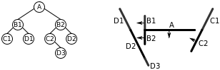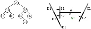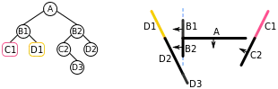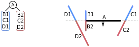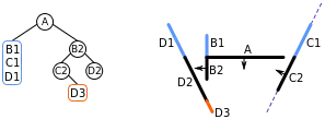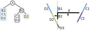 | vi. | We have now added all of the lines in front of A to the BSP tree, so we now start on the list of lines behind A. Choosing a line (B1) from this list, we add B1 to a node and split the remainder of the list into lines in front of B1 (i.e. D1), and lines behind B1 (i.e. C1). | ![]() |