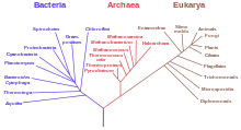 A phylogeny is an evolutionary history of a specific group of organisms or their genes.[90] It can be represented using a phylogenetic tree, a diagram showing lines of descent among organisms or their genes. Each line drawn on the time axis of a tree represents a lineage of descendants of a particular species or population. When a lineage divides into two, it is represented as a fork or split on the phylogenetic tree.[90] Phylogenetic trees are the basis for comparing and grouping different species.[90] Different species that share a feature inherited from a common ancestor are described as having homologous features (or synapomorphy).[91][92][90] Phylogeny provides the basis of biological classification.[90] This classification system is rank-based, with the highest rank being the domain followed by kingdom, phylum, class, order, family, genus, and species.[90] All organisms can be classified as belonging to one of three domains: Archaea (originally Archaebacteria); bacteria (originally eubacteria), or eukarya (includes the protist, fungi, plant, and animal kingdoms).[93]