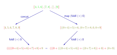 Using those two operators and the primitives (as the usual addition), and (for list concatenation), we can easily express the sum of all elements of a list, and the flatten function, as and , in point-free style. We have: