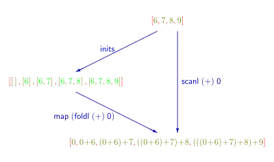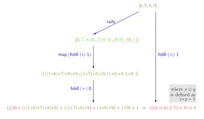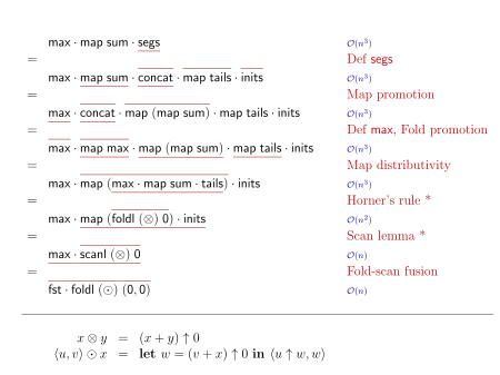 - ↑ Each expression in a line denotes an executable functional program to compute the maximum segment sum.