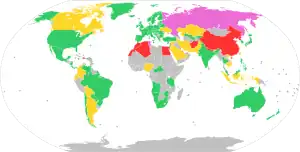 The legal status of bitcoin varies substantially from one jurisdiction to another. Because of its decentralized nature and its global presence, regulating bitcoin is difficult. However, the use of bitcoin can be criminalized, and shutting down exchanges and the peer-to-peer economy in a given country would constitute a de facto ban.[102] The use of bitcoin by criminals has attracted the attention of financial regulators, legislative bodies, and law enforcement.[103] Nobel-prize winning economist Joseph Stiglitz says that bitcoin's anonymity encourages money laundering and other crimes.[104] This is the main justification behind bitcoin bans.[10] As of November 2021, nine countries applied an absolute ban (Algeria, Bangladesh, China, Egypt, Iraq, Morocco, Nepal, Qatar, and Tunisia) while another 42 countries had an implicit ban.[105] Bitcoin is only legal tender in El Salvador.[4]