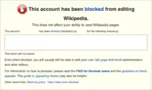 On wiki sites like Wikipedia and Wikimedia Commons, administrators (volunteers with special privileges on their accounts) can block other users from contributing to the entire site such as uploading images or editing, creating, or moving pages but this generally doesn't affect their ability to read pages on the site. Such blocks can normally only be placed with good reason such as the user vandalizing pages or uploading non-free copyrighted content after multiple warnings, and that reason is generally seen when they attempt to edit and this reason is generally made public.[6] Administrators who block users inappropriately may have their adminship revoked.[7] It is possible on some wikis for users to limit interactions from them like sending them emails or sending them notifications; with such blocks, users are not notified of them.[8]