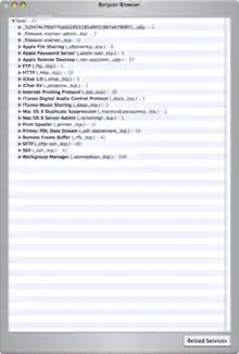 Discovery is a Creative Commons-licensed macOS application that displays all services declared using Bonjour. The program was originally called Rendezvous Browser, but changed its name in version 1.5.4 after Apple changed the protocol's name to Bonjour; since version 2.0, it has been renamed again, to Discovery. For certain protocols, double-clicking a list item will launch the associated helper. Version 1.5.6 was the first universal binary release.