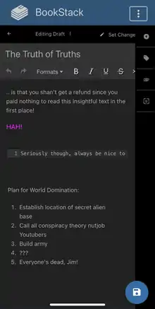 BookStack provides WYSIWYG and Markdown editors, and the Markdown editor also provides a live preview. Books, chapters and pages are fully searchable, and it is available to link directly to any paragraph.[11]