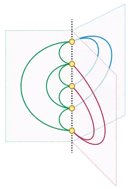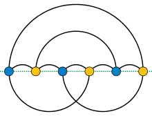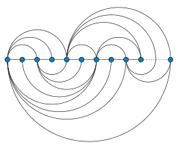 An arc diagram[53] or linear embedding[43] places vertices of a graph along a line, and draws the edges of the graph as semicircles either above or below this line, sometimes also allowing edges to be drawn on segments of the line. This drawing style corresponds to a book embedding with either one page (if all semicircles are above the line) or two pages (if both sides of the line are used), and was originally introduced as a way of studying the crossing numbers of graphs.[57][58] Planar graphs that do not have two-page book embeddings may also be drawn in a similar way, by allowing their edges to be represented by multiple semicircles above and below the line. Such a drawing is not a book embedding by the usual definition, but has been called a topological book embedding.[59] For every planar graph, it is always possible to find such an embedding in which each edge crosses the spine at most once.[60]