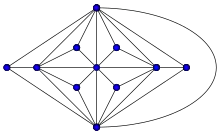 Every two-page book embedding is a special case of a planar embedding, because the union of two pages of a book is a space topologically equivalent to the whole plane. Therefore, every graph with book thickness two is automatically a planar graph. More precisely, the book thickness of a graph G is at most two if and only if G is a subgraph of a planar graph that has a Hamiltonian cycle.[10] If a graph is given a two-page embedding, it can be augmented to a planar Hamiltonian graph by adding (into any page) extra edges between any two consecutive vertices along the spine that are not already adjacent, and between the first and last spine vertices. The Goldner–Harary graph provides an example of a planar graph that does not have book thickness two: it is a maximal planar graph, so it is not possible to add any edges to it while preserving planarity, and it does not have a Hamiltonian cycle.[10] Because of this characterization by Hamiltonian cycles, graphs that have two-page book embeddings are also known as subhamiltonian graphs.[12]