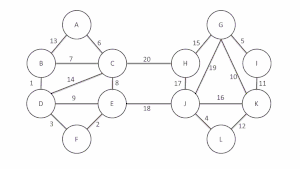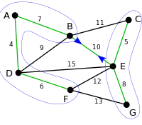 {A,B,C,D,E,F,G} | In the second and final iteration, the minimum weight edge out of each of the two remaining components is added. These happen to be the same edge. One component remains and we are done. The edge BD is not considered because both endpoints are in the same component. |