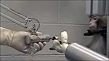The Carney Institute reported training rhesus monkeys to use a BCI to track visual targets on a computer screen (closed-loop BCI) with or without a joystick.[40] The group created a BCI for three-dimensional tracking in virtual reality and reproduced BCI control in a robotic arm.[41] The same group demonstrated that a monkey could feed itself pieces of fruit and marshmallows using a robotic arm controlled by the animal's brain signals.[42][43][44]