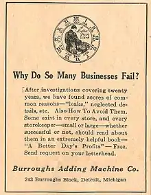 In 1886, the American Arithmometer Company was established in St. Louis, Missouri, to produce and sell an adding machine invented by William Seward Burroughs (grandfather of Beat Generation author William S. Burroughs). In 1904, six years after Burroughs' death, the company moved to Detroit and changed its name to the Burroughs Adding Machine Company. It was soon the biggest adding machine company in America.[1]